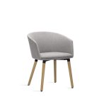 Base fija de cuatro patas de madera con encastre al casco en negro. Cuerpo compuesto por espuma revestido en diferentes tipos de telas según catálogo.